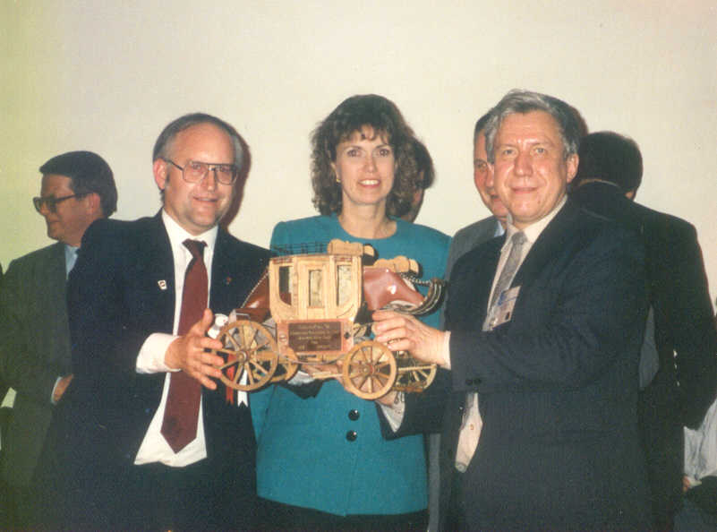 . Председатель ACM SIGGRAPH Дж.Томас (слева) и исполнительный секретарь ACM SIGGRAPH Беверли Акино вручают председателю оргкомитета Графикона-91 Ю.Ф.Голубеву (справа) памятный сувенир оргкомитету Графикона – карету с соответствующей табличкой. (В настоящее время вместе с другими реликвиями хранится у меня в офисе с готовностью передать в музей Графиконов, если таковой будет организован). На заднем плане слева – Б.Долговесов. Позади Ю.Ф.Голубева просматривается С.П.Курдюмов.