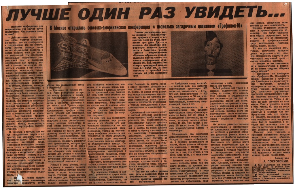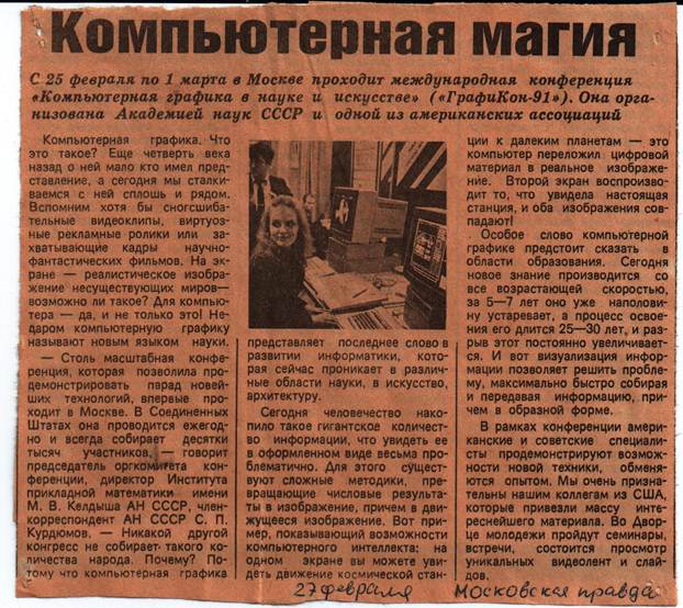 Рис.2. На этих двух сканах(склеены) помещена статья, посвященная Графикону-91, в самой главной в СССР газете «Правда», органе ЦК КПСС. (Все разборчиво читается, если увеличить, большая картинка по клику)